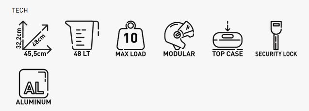 Помимо алюминия в конструкции используется нержавеющая сталь. Углы, профили и петли для ремней сделаны из технополимера. 48 литров объема хватит для шлема-модуляр и еще останется место. Если все вещи не поместились в кофр, на крышке есть петли, чтобы привязать их сверху ремнями или сеткой. Для переноски предусмотрены прочные металлические ручки.