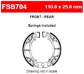 Колодки тормозные барабанные FE FSB704 110x25 mm . Подходят на китайские скутеры с диаметром колеса 10 и 12 дюймов и на китайские мопеды с диаметром колеса 17 дюймов.