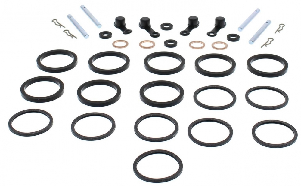 Ремкомплект тормозного суппорта All Balls предназначен для быстрого ремонта суппортов мотоцикла при закисании направляющих или поршней, повреждении резиновых уплотнителей. Комплект обычно включает в себя сальники и пыльники поршней, направляющие пальцы тормозных колодок, резиновые уплотнители, колпачок прокачного штуцера и медные шайбы для банджо-болта.